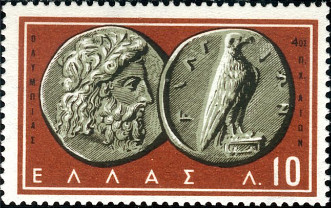 Katalogangabe (Michel): <Ausgabedatum> 24. März 1959; <Anlass> Freimarken: Altgriechische Münzen; <Bildinformation> Olympia: Kopf des Zeus/Adler (4. Jahrh. v. Chr.)