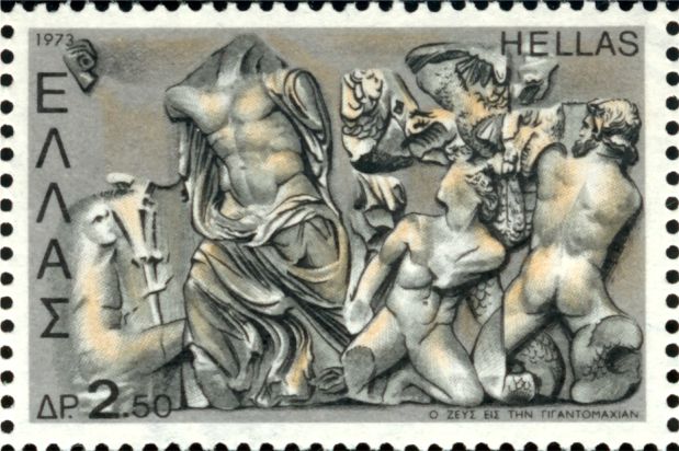 Katalogangabe (Michel): <Ausgabedatum> 25. Juni 1973; <Anlass> Griechische Mythologie; <Bildinformation> "Zeus beim Kampf mit den Riesen" Auch wenn die Bildinformation nicht darauf hinweist, handelt es sich hier doch um ein Bild aus dem Pergamonaltar, hier eine Szene mit Zeus im Vordergrund. Vom Pergamonaltar stammt auch die Szene mit Athene. Giganten: furchterregende, gewaltige, oft schlangenfüßig dargestellte Riesen der