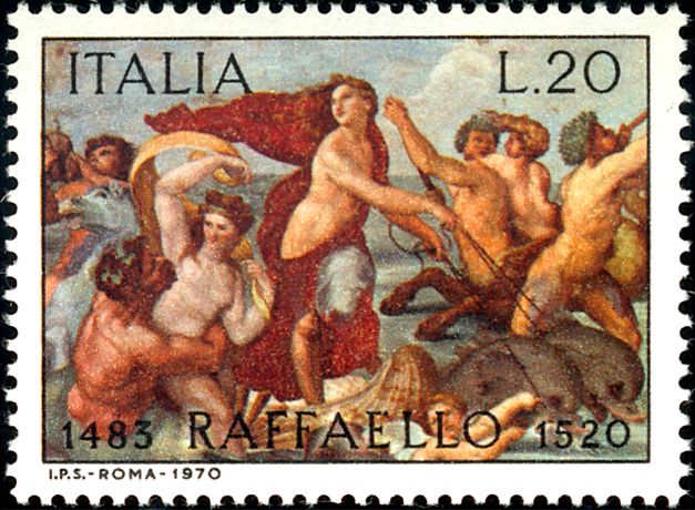 Katalogangabe (Michel): <Ausgabedatum> 6. April 1970; <Anlass> 450. Todestag von Raffaello Santi; <Bildinformation> Triumph der Galatea; Ausschnitt aus Fresko von Raffael (1483-1520) Galateia, lat. Galatea, schöne Nereide, Tochter des Nereus und der Doris. Sie liebte den ungeschlachten Kyklopen Polyphemos; nach einer anderen Sagenversion wandte sie ihre Gunst dem jungen Akis zu. Polyphemos tötete diesen aus Eifersucht mit einem Felsblock. |