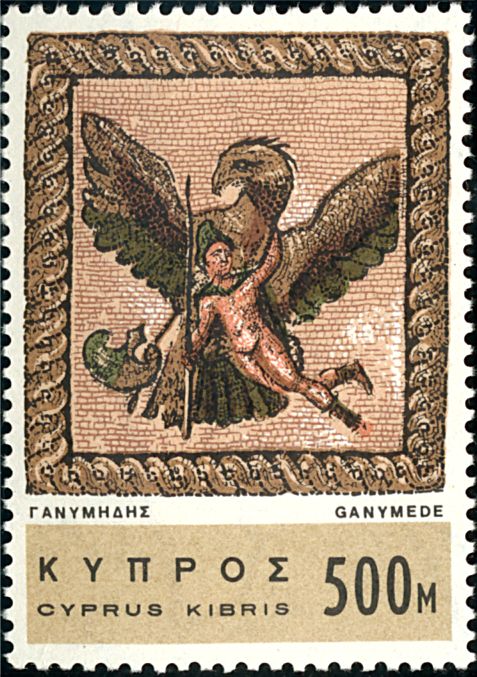 GANYMEDES Katalogangabe (Michel): <Ausgabedatum> 21. November 1966; <Anlass> Freimarken: Aus der Kulturgeschichte Zyperns; <Bildinformation> "Raub des Ganymedes", Fußbodenmosaik, 3. Jh. Ganymedes, dt. Ganymed, in der griechischen Sage Schönster der Sterblichen, Sohn des Königs Tros; von Zeus auf den Olymp entführt, damit er dort Mundschenk für die Götter sei. Nach späterer Version ließ Zeus ihn durch seinen Adler rauben (oder raubte ihn in Adlergestalt) und machte ihn zu seinem Geliebten (Motiv der Knabenliebe). Mehr über diesen Ganymed auf der Seite des Dionysoshauses von Paphos, aus dem das Ganymed-Mosaik stammt. |