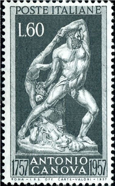 HERAKLES - HERCULES Katalogangabe (Michel): <Ausgabedatum> 15. Juli 1957; <Anlass> 200. Geburtstag von Antonio Canova <Bildinformation> Herakles und Lichias <sic!>. Skulptur von A. Canova Im Sterben hatte der Kentaur Nessos Herakles' Frau Deianeira geraten, sein, des Nessos, Blut als Liebeszauber - bei Bedarf - zu verwenden. Vor Deianeira hatte Herakles um Iole in der Stadt Oichalia geworben, doch deren Vater Eurytos hatte Herakles um ihre Hand betrogen. Nun mit Deianeira verheiratet, beginnt Herakles einen Rachefeldzug gegen den König Eurytos, der zusammen mit seinen Söhnen fällt. Iole gerät in Gefangenschaft - und Deianeira wird ob der schönen Iole eifersüchtig. Sie erinnert sich an Nessos' Rat und salbt Herakles' Opfergewand mit einer Salbe aus dem Blut des Nessos. Lichas, Herakles' Bote, überbringt im Auftrag Deianeiras das Gewand, unter dem Herakles aber verbrennt; er versucht, es sich wieder vom Leib zu reißen. In seinem Schmerz und seiner Wut zerschmettert Herakles den Lichas an einem Felsen und wirft ihn ins Meer: Diese Bestrafung des Lichas hat Canova hier dargestellt. Anlässlich einer Versteigerung einer Bronzenachbildung informiert die Firma Koller über den Mythos und auch die Entstehungsbedingungen der Marmorgruppe, die von Canova um 1800 in mehrjähriger Arbeit erstellt wurde. Über Canovas Biographie - aber kaum über diese Statue - informiert Verena Conrad auf der Seite "Artisti Italiani in Austria". Seltsamerweise befindet sich, außer dieser Briefmarke, im Netz keine Abbildung der Canova-Plastik. |