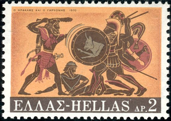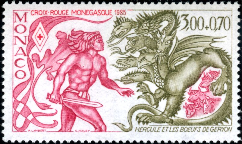 HERAKLES - HERCULES: 10. ARBEIT Katalogangabe (Michel): <Ausgabedatum> 7. November 1985; <Anlass> Rotes Kreuz: Die Arbeiten des Herakles <Bildinformation> Herakles bewältigt <sic!> die Rinder des Geryon Katalogangabe (Michel): <Ausgabedatum> 16. März 1970; <Anlass> Freimarken: Die Heldentaten des Herakles <Bildinformation> Herakles und der Riese Gyrionis <sic!>, Darstellung auf einer antiken Amphore Geryoneus, Sohn des Chrysaor und damit Enkel der Gorgo Medusa, besitzt auf der weit im Westen liegenden Insel Erytheia eine Rinderherde. Im goldenen Becher, den ihm Helios, der Sonnengott geschenkt (Hunger: "geborgt") hat, gelangt Herakles auf diese Insel, tötet erst die Wächter der Herde, den Riesen Eurytion und den zweiköpfigen Hund Orthros oder Orthos und will die Herde forttreiben. Dabei stellt ihn der dreileibige Riese Geryoneus zum Kampf, den natürlich Herakles gewinnt. Die Dreileibigkeit scheint hier auf dem Vasenbild durch drei Personen dargestellt zu sein, auf der monegassischen Marke scheint eher die Chimaira Pate gestanden zu haben. |