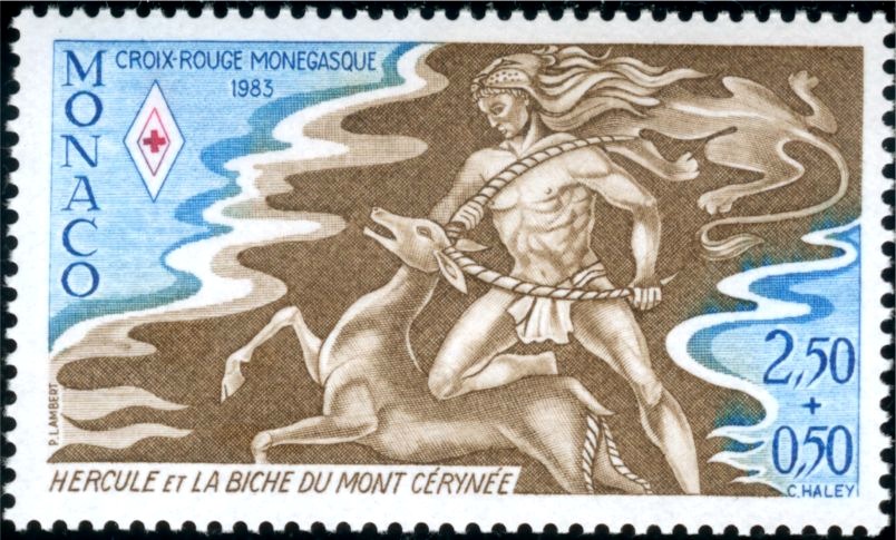 HERAKLES - HERCULES: 3. ARBEIT Katalogangabe (Michel): <Ausgabedatum> 9. November 1983; <Anlass> Rotes Kreuz: Die Arbeiten des Herakles <Bildinformation> Herakles fängt die Kerynitische Hirschkuh Ein Jahr lang jagt der Held die der Artemis heilige Hindin mit goldenem Geweih und ehernen Füßen, bis er sie am Fluß Ladon erlegt. |
