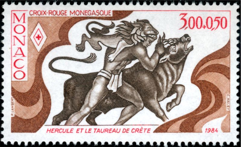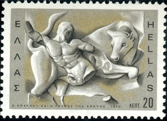 HERAKLES - HERCULES: 7. ARBEIT Katalogangabe (Michel): <Ausgabedatum> 8. November 1984; <Anlass> Rotes Kreuz: Die Arbeiten des Herakles <Bildinformation> Herakles fängt den Kretischen Stier Katalogangabe (Michel): <Ausgabedatum> 16. März 1970; <Anlass> Freimarken: Die Heldentaten des Herakles <Bildinformation> Herakles besiegt den kertischen (sic!) Stier, Metopenrelief vom Zeustempel in Olympia (5. Jh. v. Chr.) Mit der 7. Arbeit, dem Fang des kretischen Stiers, verlässt Herakles den Bereich der Peloponnes und geht sozusagen nach "Übersee", nach Kreta. - Dort hatte König Minos Poseidon um ein schönes Opfertier gebeten. Als dann der prächtige Stier aus dem Meer erscheint, wird er von Minos nicht geopfert, sondern seiner eigenen Herde einverleibt. Darauf lässt Poseidon den Stier wütend werden. Diesen rasenden Stier fängt Herakles, bringt ihn nach Mykene, lässt ihn dort aber wieder frei. Erst Theseus kann den Stier dann in Marathon zur Strecke bringen. Diese Darstellung auf der griechischen Marke und die des Atlas, der die Äpfel der Hesperiden bringt, sind keine Vasenbilder, sondern Metopen vom Zeustempel in Olympia. Metopen sind die Bildfelder am Architrav eines dorischen Tempels, die durch Triglyphen ("Dreistäbe"), voneinander getrennt werden. |