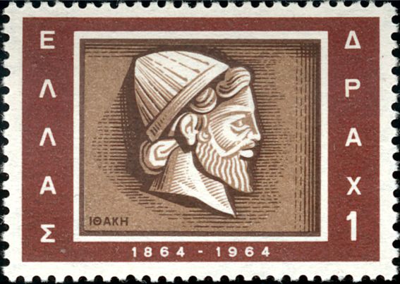 Katalogangabe (Michel): <Ausgabedatum> 20. Juli 1964; <Anlass> 100. Jahrestag der Vereinigung der Ionischen Inseln mit Griechenland; <Bildinformation> Wappen der Insel Ithaka, Odysseus Odysseus trägt auf der stilisierten Abbildung seinen Eberzahn-Helm. Mehr zu Odysseus s. bei Homer.