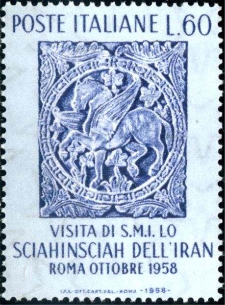 Katalogangabe (Michel): <Ausgabedatum> vorgesehen für den 9. Oktober 1958; <Anlass> Besuch des Schahs von Persien in Rom; <Bildinformation> Relief aus dem Dom von Sorrent Momentan noch ein großes Rätsel: Welchen Bezug zum Schah von Persien hat diese Pegasus-Darstellung aus dem Dom von Sorrent? |