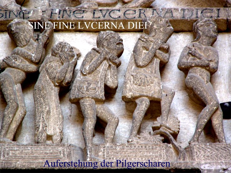 ![]() QVISQVE RESVRGET ITA QVEM NON TRAHIT IMPIA VITA ET LVCEBIT EI SINE FINE LVCERNA DIEI (... und es wird ihm in Ewigkeit leuchten das Licht des Tages.) Stellvertretend für die Pilgerscharen ein Jerusalempilger links und ein Santiagopilger rechts, erkennbar an der großen Jakobsmuschel, dem mittelalterlichen Pilgerzeichen. |