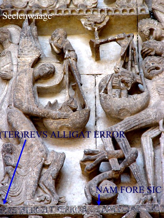 ![]() TERREAT HIC TERROR QVOS TERRVS ALLIGAT ERROR NAM FORE SIC VERVM MOTAT HIC HORROR SPECIERV(M) (Schrecken soll dieser Schrecken die, die irdischer Irrtum in Fesseln hält, denn dass es so wirklich sein wird, macht hier das Entsetzen der Gestalten deutlich.) Michael, der die Seelen wägt, der Nachfolger des Hermes/Merkur, des Psychopompos, des Seelengeleiters. Wer genug Gewicht hat, darf ins Elysium, zu den Erlösten, wer zu leicht befunden wird, auf den freuen sich schon die gierigen Teufel hinter der Waage. |