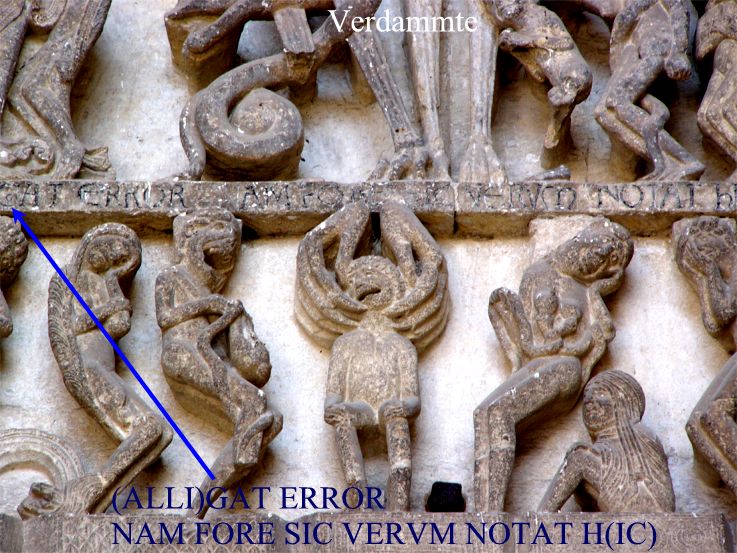 ![]() TERREAT HIC TERROR QVOS TERRVS ALLIGAT ERROR NAM FORE SIC VERVM MOTAT HIC HORROR SPECIERV(M) (Schrecken soll dieser Schrecken die, die irdischer Irrtum in Fesseln hält, denn dass es so wirklich sein wird, macht hier das Entsetzen der Gestalten deutlich.) Beim Text wird deutlich, dass das "N" von NAM nicht nachgezogen ist, dass andererseits das "M" der Zodiaque-Wiedergabe in Wirklichkeit ein "N" ist. Die Verdammten schaudern der Ewigkeit entgegen, besonders die Gestalt mit den riesigen Greifhänden am Hals. Links von ihr ein Opfer der Todsünde "Geiz", rechts ein weibliches Opfer der "Luxuria", der Verschwendungssucht. |