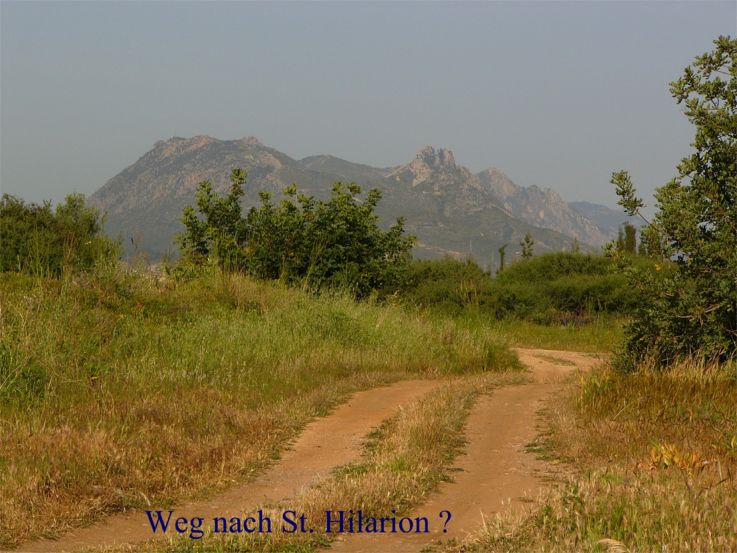 In der Ferne, aber in der angebahnten Richtung des Feldweges, liegt die Festung von St. Hilarion; der Doppelgipfel des Bergstockes ist gut zu erkennen. Deswegen sprach man auch von "Didymoi", "Zwillinge", was dann unter den französischen Lusignans zu "Dieu d'Amour" verändert wurde. |