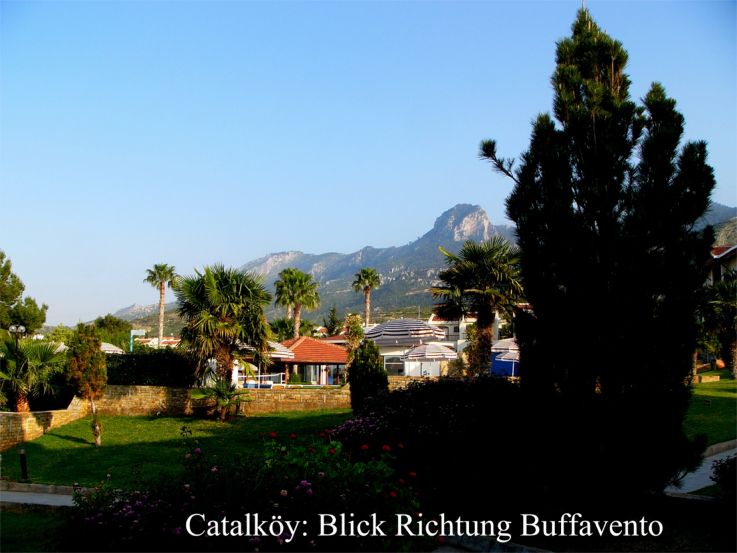 Die Hotelanlage am späteren Nachmittag: unter den Schirmen im Vordergrund der große Swimming Pool, hinten ragt aus der Kyrenia-Kette die Festung Buffavento heraus. Man blickt hier etwa nach Südosten. |