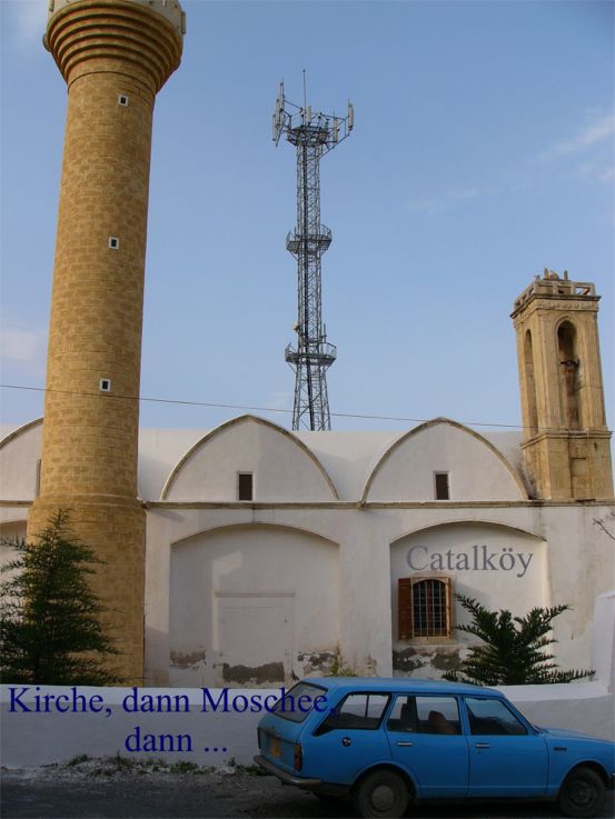 Der dritte Turm gehört (noch) nicht zur Anlage. Am Glockenturm ist die frühere Kirche gut zu erkennen, das Minarett weist auf die derzeitige Funktion hin. Bei Karmi sah ich eine verlassene Kirche, etwas außerhalb des Ortes, aus deren Fenster schon ein Feigenbaum herauswuchs, deren Dach schon schadhaft wurde: Was ist da besser - auch wenn es die alten Einwohner schmerzt? |