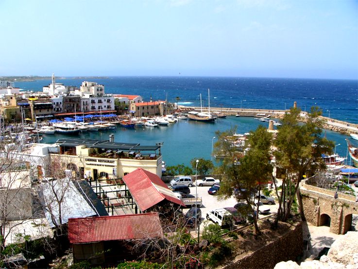 Kyrenias Hafen von oben, vom Kastell aus gesehen. Neben der Mole erkennt man das Zollgebäude; von hier wurde zum Turm, der in der Lücke der beiden Bäume zu sehen ist, die erwähnte Kette gespannt. Soweit der Hafenrand bebaut ist, befinden sich in den Häusern Lokale, wie man am Restaurant vorne oder an den blauen Schirmen dahinter erkennen kann. Die Brücke am rechten Bildrand führt zum Eingang des Kastells. |