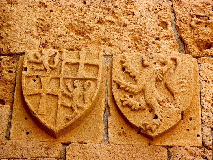 Die Wappen über dem Eingang der alten byzantinischen Festung. Analog zur Wappenerklärung von Kolossi müsste es sich rechts um das Wappen der Lusignans, links um das Königswappen von Zypern handeln (zweimal Kreuz für die Könige von Jerusalem, links oben Löwe von Kleinarmenien (?), rechts unten noch einmal Lusignan-Löwe fürs Königreich Zypern). |