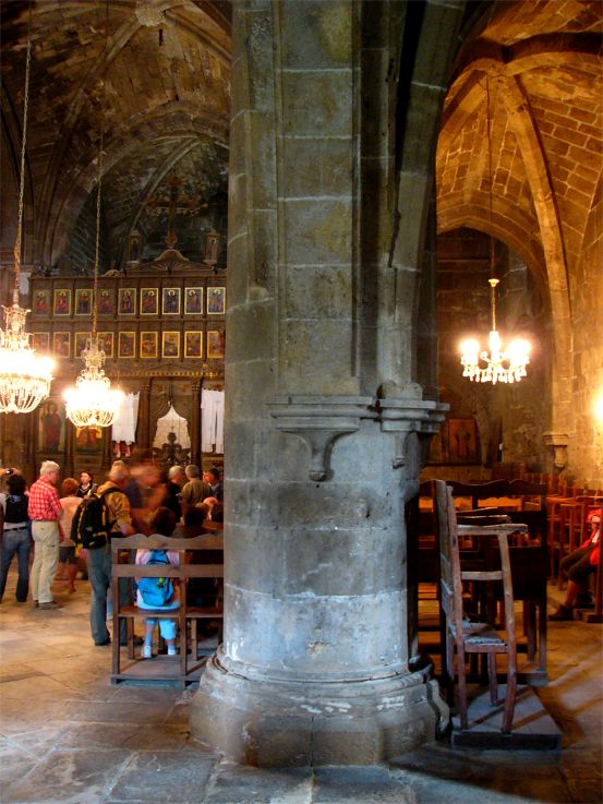 Inneres der Klosterkirche: rechts das südliche Seitenschiff, links im Mittelgrund die Ikonostase.