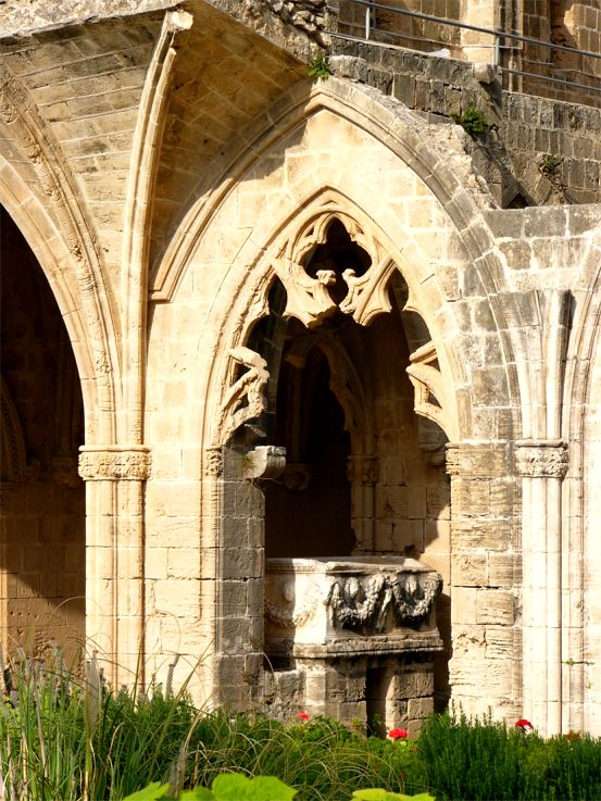 Die Nordwestecke des Kreuzgangs von Westen. Vor dem Eingang ins Refektorium steht der alte Sarkophag.