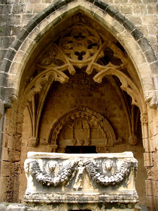 Fensteröffnung steht ein alter Sarkophag, dahinter befindet sich das