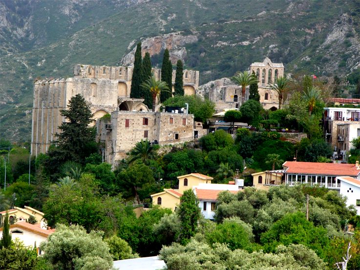 Bellapais von Westen: links der große Block des Refektoriums, daneben der Kreuzgang mit seinen vier Zypressen und noch weiter rechts die Klosterkirche.