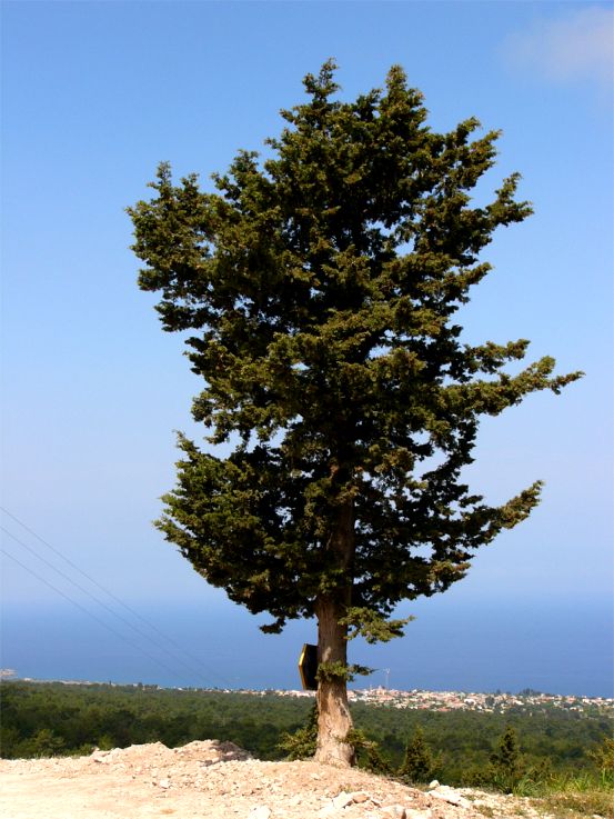 Wegweisende Zeder, dahinter Esentepe oberhalb der Meeresküste.