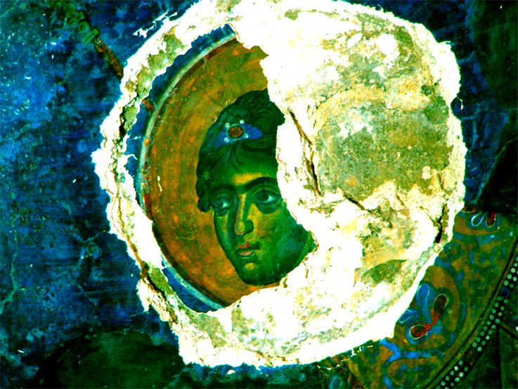 Rest des Erzengels Michael in der Apsis. Den Zustand deute ich so, dass der Versuch, den Kopf samt Heiligenschein hier herauszulösen und ihn auf dem Schwarzmarkt zu verhökern, gründlich misslungen ist. Der erhaltene Rest zeugt aber von der Qualität der Malerei. |