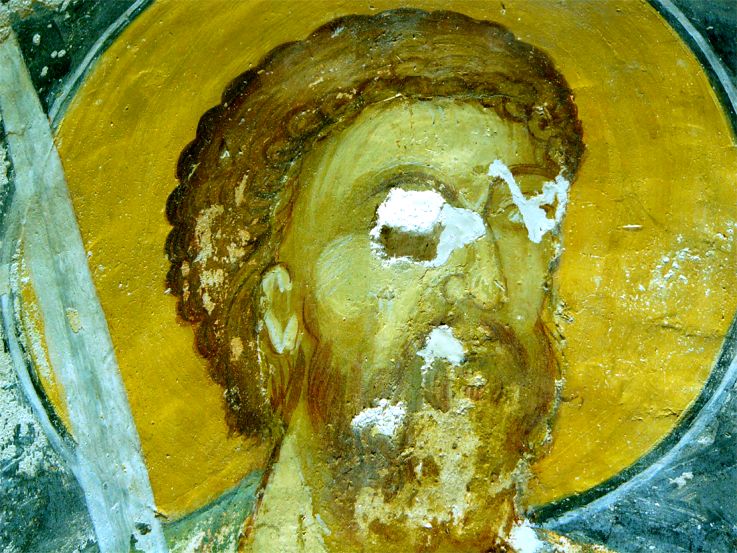 Gesicht des Heiligen Paulus. Die ausgekratzten Augen können auch daher rühren, dass man deren Material für heilkräftig gehalten hat und es deshalb aus dem Gesicht herausgekratzt hat.
