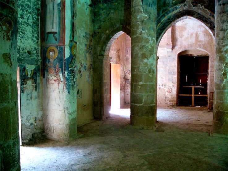 Das Innere der Kirche mit den beiden Türen auf der Südseite und dem versperrten Westportal. Gut erkennbar drei der acht Kuppelstützen.