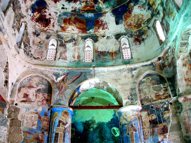 Blick im Kircheninneren nach Osten, unten die beiden Chorstützen, links mit einer Michaelsdarstellung, über ihm der Cherub, der sechsflüglige Engel, die stehenden Heiligen in der Fensterzone und die thronenden im Band darüber auf dem Ansatz der Kuppel. |