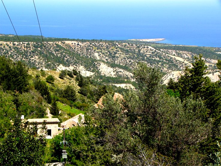 Kloster Antiphonitis in einem kleinen Tal, das hier gut erkennbar zum Meer hin führt. Von der Klosterkirche erkennt man die Kuppel und ein Fenster im Giebel der Vorhalle.