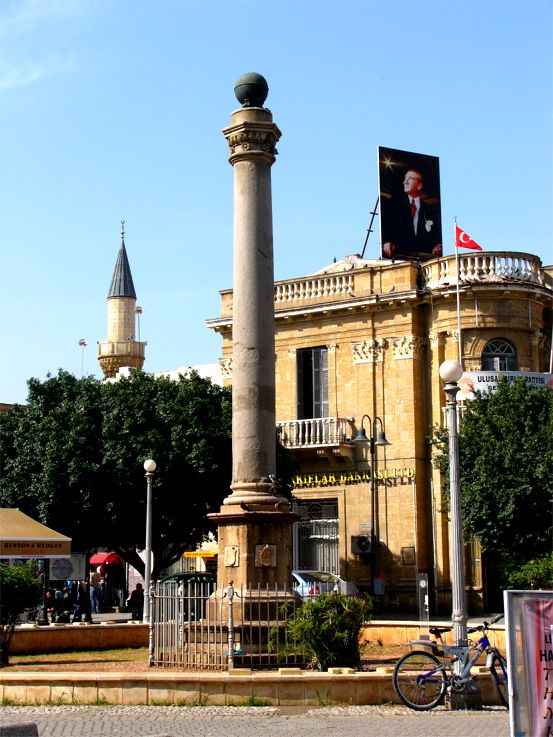 Die Säule steht im Zentrum eines Sterns, auf der Mauerumfriedung außen steht "Point Zero", demnach war dieser Punkt Ausgang für die innerzyprische Vermessung zur Kolonialzeit; da Nikosia aber einen kreisförmigen Grundriss hat und in seinem Mittelpunkt etwa der Basar liegt, verwundert es (mich), dass man fürs Zentrum so exzentrisch vorging. |