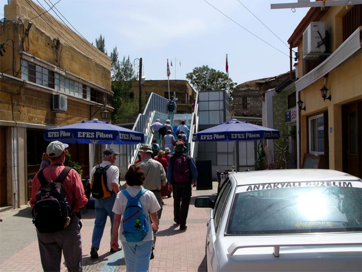 Aufgang auf der türkischen Seite, um über die Grenze in den bösen griechischen Teil zu schauen. Man sieht vor allem das verwahrloste Niemandsland, und ich hatte den Eindruck, dass der griechischen Seite daran liegt, diese Gegend möglichst unwirtlich erscheinen zu lassen. Auf der türkischen Seite herrschte bis viel näher an die Grenze lebhafter Betrieb. |