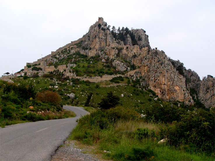 Nach der Durchfahrt durch militärisch bewachtes Gelände fährt man um eine Kurve und hat diesen Blick auf die Burg vor sich: Links die Byzantinische Mauer, rechts auf dem Felsen die Unterburg und oben der Turm des Prinzen Jean. |