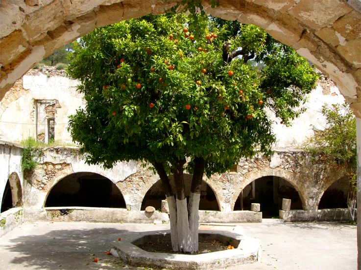 So könnte man fast vergessen, dass man sich in einer verfallenden Ruine befindet: Orangenbaum im Hof des Kreuzgangs von Sourp Magar.