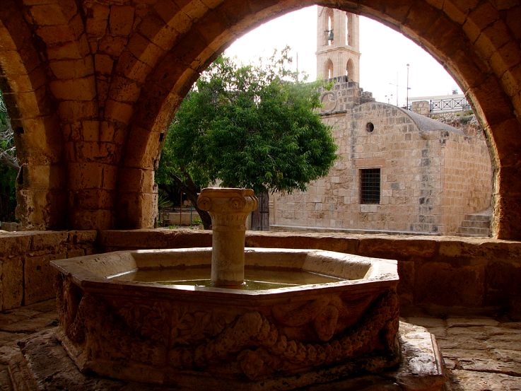 Blick aus dem Brunnenhaus zur Klosterkirche. Man sieht hier gut, dass der Glockenturm später errichtet wurde als die Kirche.