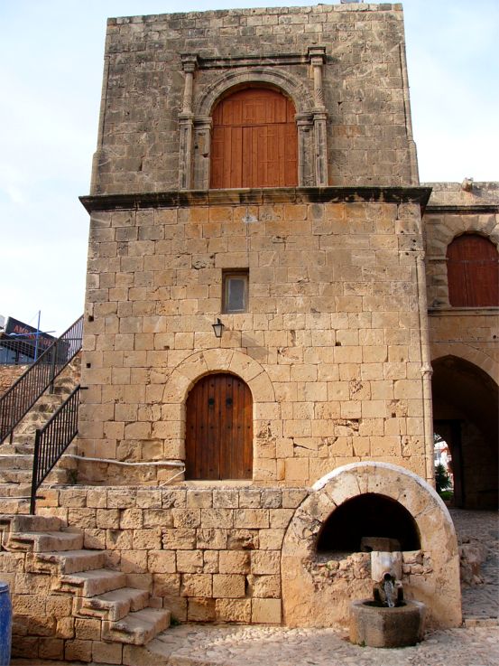 Zweigeschossiger Turm im Klosterhof von Ayia Napa. Vor ihm spendet der Eberbrunnen sein Wasser.
