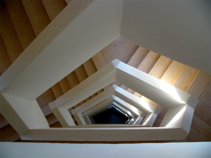 Das ließe sich - bei der entsprechenden rhetorischen Begabung - in mancher Kunstgalerie als "Moderne Kunst" an die Wand hängen. Es ist aber nur ein Blick ins Treppenhaus des Hotels.