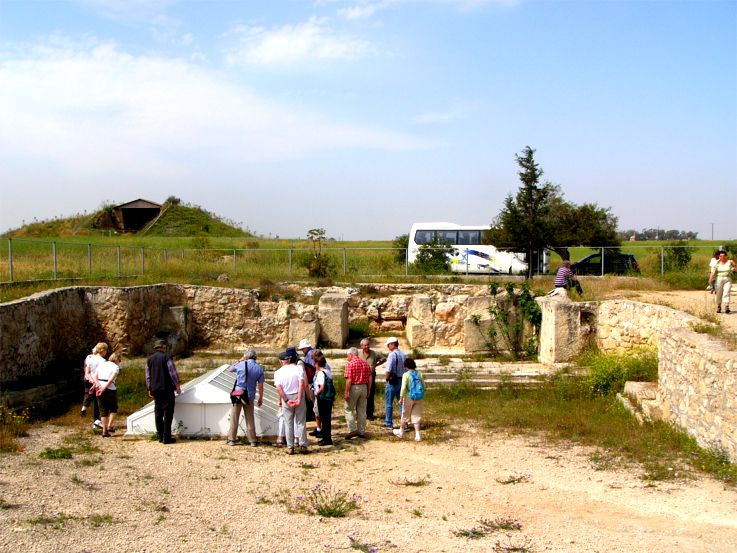 Blick ins Grab 47 von Osten. Die Gruppe bekommt gerade das im Dromos liegende Pferdegrab erklärt, dahinter erkennt man den Zugang zur Grabkammer; hinter dem Weg, vom Bus bezeichnet, sieht man links das Grab 3 und in der Ferne rechts hinten das Barnabaskloster. |
