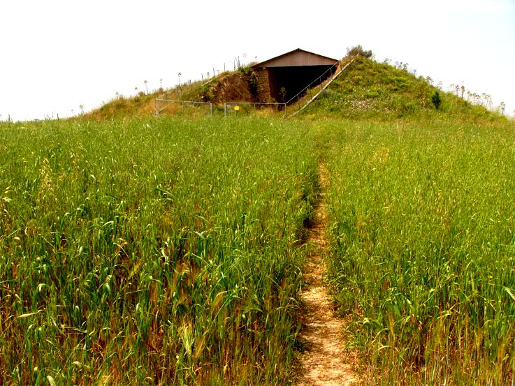Ein kleiner Pfad im Acker führt zum Grab 3, dessen Schutzbau aus der Ebene herausragt.
