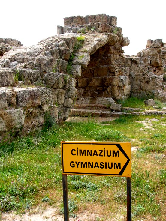 Im Hintergrund steht ein Bogen der alten Heizanlage der Thermen, so die Bezeichnung im Baedeker.