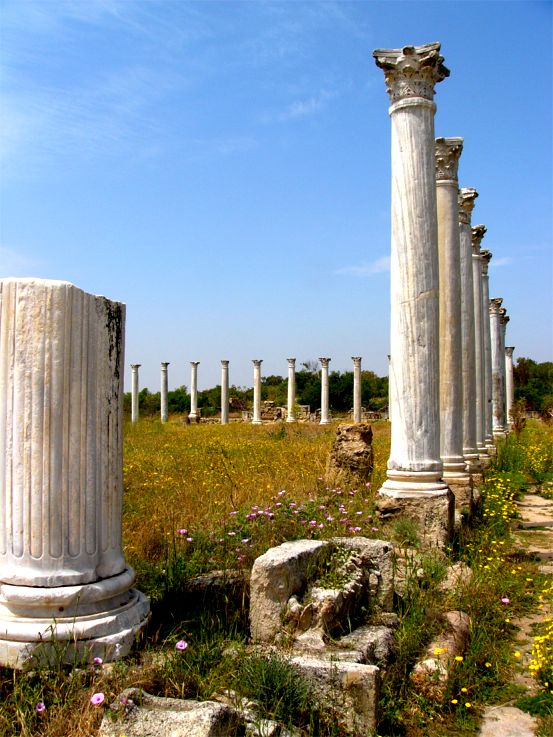 Nördliche und im Hintergrund westliche Säulenreihe der Palästra.