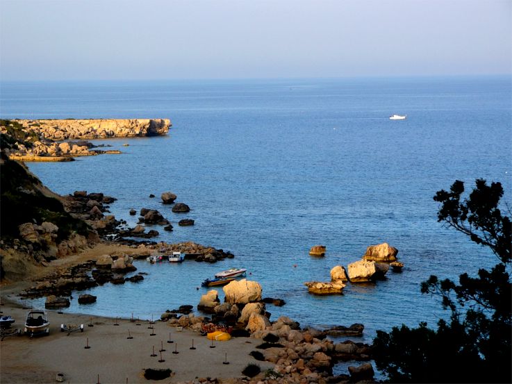 Auch am späten Nachmittag wirkt diese Bucht südlich des Hotels "Grecian Park" recht stimmungsvoll; den Sonnenaufgang wie auf der Marke konnte ich leider nicht einfangen.
