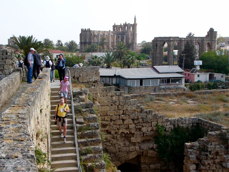 Die Nikolauskathedrale und die Ruine der Georgskirche der Lateiner vom Othelloturm aus gesehen; in Famagusta fallen um die alten Gebäude und Ruinen die vielen Freiflächen auf, wie hier die von Palmen bestandene Fläche im Vordergrund. |
