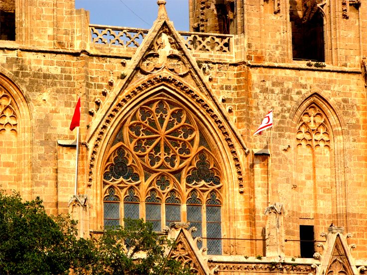 Über dem Mittelschiff das Rosenfenster, über den Seitenschiffen Blendfenster.