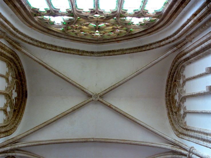 Gewölbe im westlichsten Joch des Mittelschiffs mit dem Maßwerk der Rose aus dem