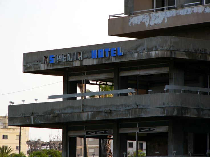 Fensterloses Betongerippe über dem Eingang des früheren Hotels Aspelia.