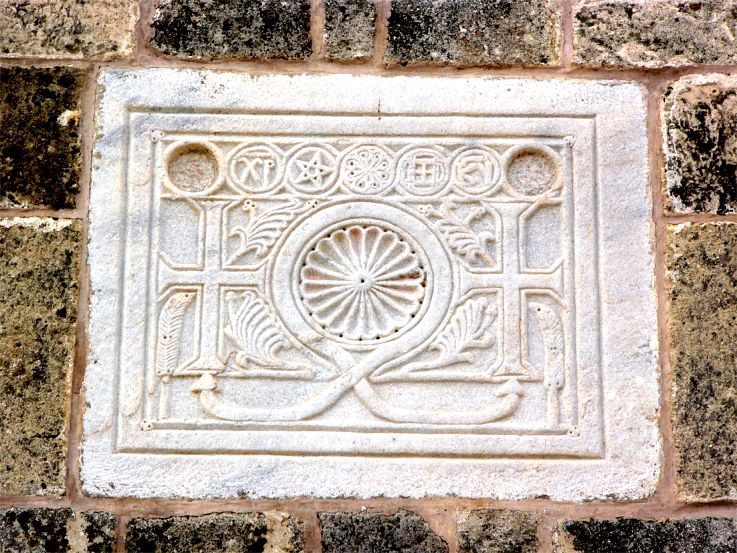 Marmorplatte aus dem Glockenturm. Die beiden Näpfchen lassen an eine Altarplatte denken - aber das wäre eine eigenartige Verwendung!