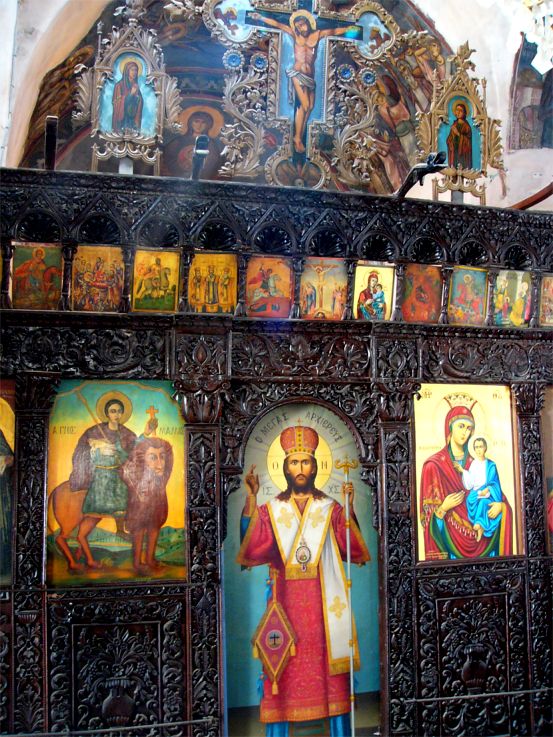 Tor der Ikonostase vor der südlichen Apsis: in der Mitte Christus als Hoherpriester, rechts die namengebende Mutter Gottes ("Panhagia Theotokou"), links der Heilige Mammas, Patron der Steuerhinterzieher. |