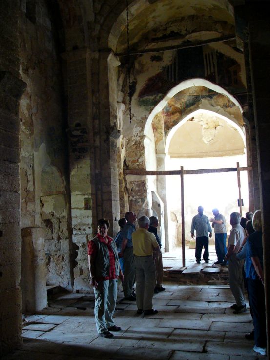 Blick durchs Mittelschiff nach Osten, in die Hauptapsis. Die Holzstangen deuten an, wo man sich die Ikonostase vorstellen soll.