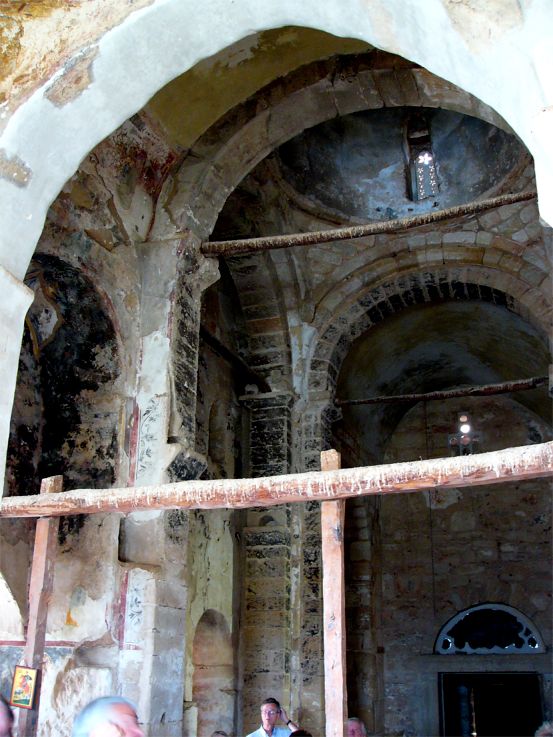 Blick aus der Apsis der Kirche in das Langhaus, leicht nach Süden. Der frisch geweißte Gurtbogen über dem Andeutungsbalken der Ikonostase ist wohl der Ursprungsort vieler verschwundener Mosaiken, weiteres s. Markeninformation. |