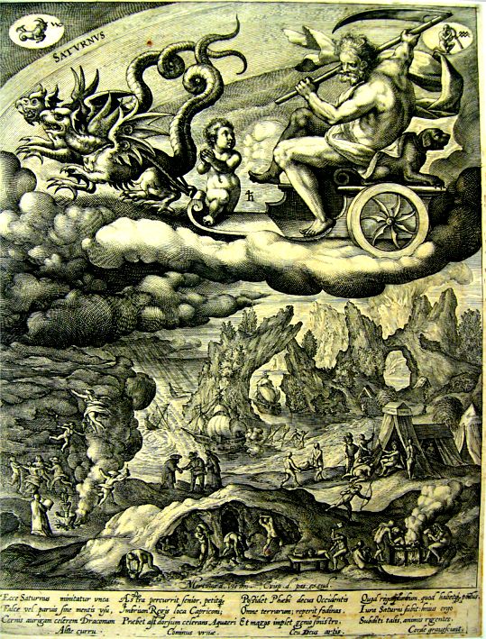 Ecce Saturnus minitatur unca Astra percurrit senior, petitque Possidet Phoebi decus Occidentis Quod riget plumbum, quod habetque pondus, Übersetzung: "Siehe, Saturn droht mit gekrümmter /