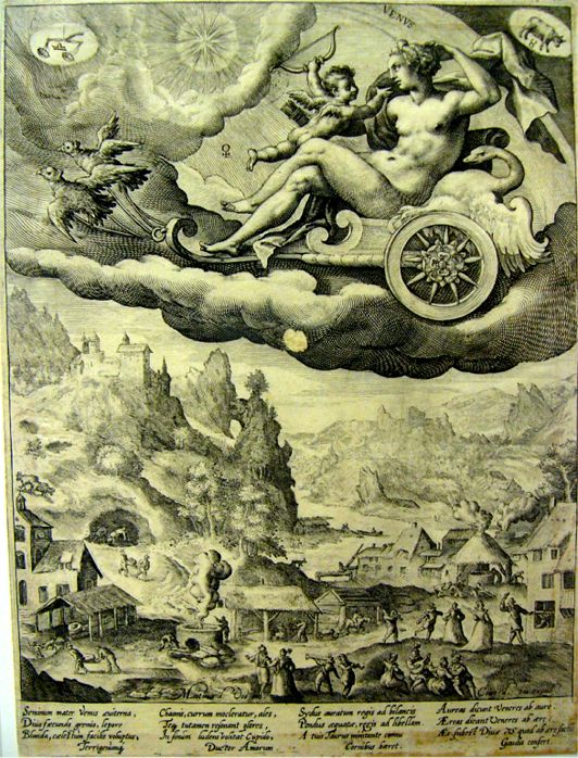 Seminum mater Venus aeviterna, Chaonis, currum moderatur ales, Sydus auratum regis ad bilancis Aureas dicunt Veneres ab auro. Übersetzung: "Der Geschlechter Mutter, Venus, ewige, /